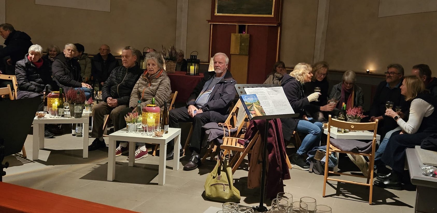 Sich zurücklehnen, das entspannte Ambiente auf sich wirken lassen, gerne auch mit einem Wasser oder Glas Wein. Und das nicht in der Kirchenbank sondern in kleinen Gruppen nach Gusto zusammensitzend, mit einem Tischchen vor sich, um das Glas abzustellen. Dazu Chormusik und Texte zum Nachdenken. Thema das Abends war „Schöpfung bewahren“ im weitesten Sinne, Klimawandel und was uns dabei umtreibt, im Engeren. Auch der Bezug zum Wein fehlte natürlich nicht, genauso wenig wie der spirituelle Anteil im Gebet.