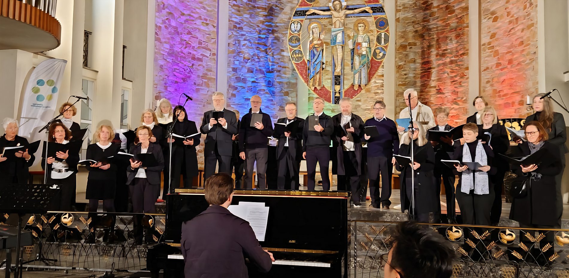 7 Chöre, eine Kirche: Vocalitas war auch dabei! Unter der Leitung von Manuel Bleuel, ehemals Regionalkantor Taunus, seit August Regionalkantor für die Stadtkirche Frankfurt, der an diesem Abend die musikalische Leitung in der Kirche St. Katharina in Bad Soden inne hatte, entstand ein musikalisch buntes Programm. Die Musik flankierte die Texte von Pater Helmut Schlegel, anlässlich des 800. Jubiläums des Sonnengesangs des heiligen Franz von Assisi, die im Mittelpunkt der Schöpfungsnacht an diesem Samstagabend standen. Die große Kirche in Bad Soden war voll und die meisten der Gäste harrten bis zum Schluss aus (immerhin nach 22 Uhr). Neben Ohren- gabs auch Augenschmaus, denn die Künstlergruppe Glashütten stellte dort vom Sonnengesang inspirierte Werke aus.