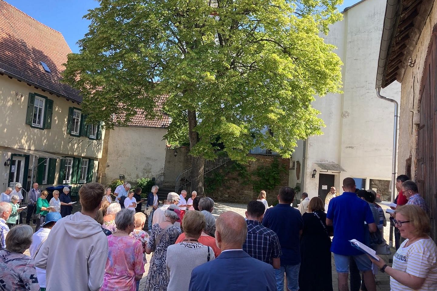 Am 60. Tag nach Ostern und dem zweiten Donnerstag nach Pfingsten begeht die katholische Kirche das Hochfest Fronleichnam, das „Fest des heiligsten Leibes und Blutes Christi". Mit feierlichen Prozessionen bringen die katholischen Gläubigen öffentlich ihren Glauben zum Ausdruck, dass Gott in Brot und Wein mitten unter ihnen ist. So sind auch in Schloßborn gut 70 Menschen aus allen 3 Ortsteilen und sogar von außerhalb nach dem feierlichen Gottesdienst, zelebriert von Pater Rajulaparimellu Vijay Kumar, in einer festlichen Kurzprozession von der Kirche in den Pfarrhof gezogen (siehe Foto).