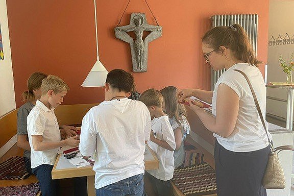 Beim anschließenden Frühschoppen Im Gemeindehaus waren alle Altersgruppen vertreten: Kinder haben mit Begeisterung Kerzen mit Klebe-Tatoos gestaltet, die Erwachsenen sowohl im als auch auf dem Freisitz vor dem Gemeindehaus in entspannter Atmosphäre und versorgt mit ausreichend Bratwürsten, Brezeln und Waffeln sowie allerlei kühlender Getränke im gemütlichen Austausch verbracht.